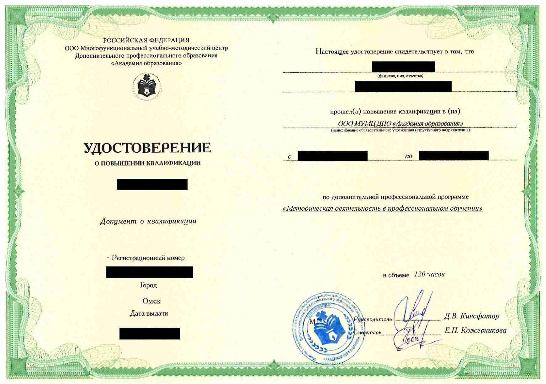 - Удостоверение о повышении квалификации установленного государством образца. Срок действия: 3 года